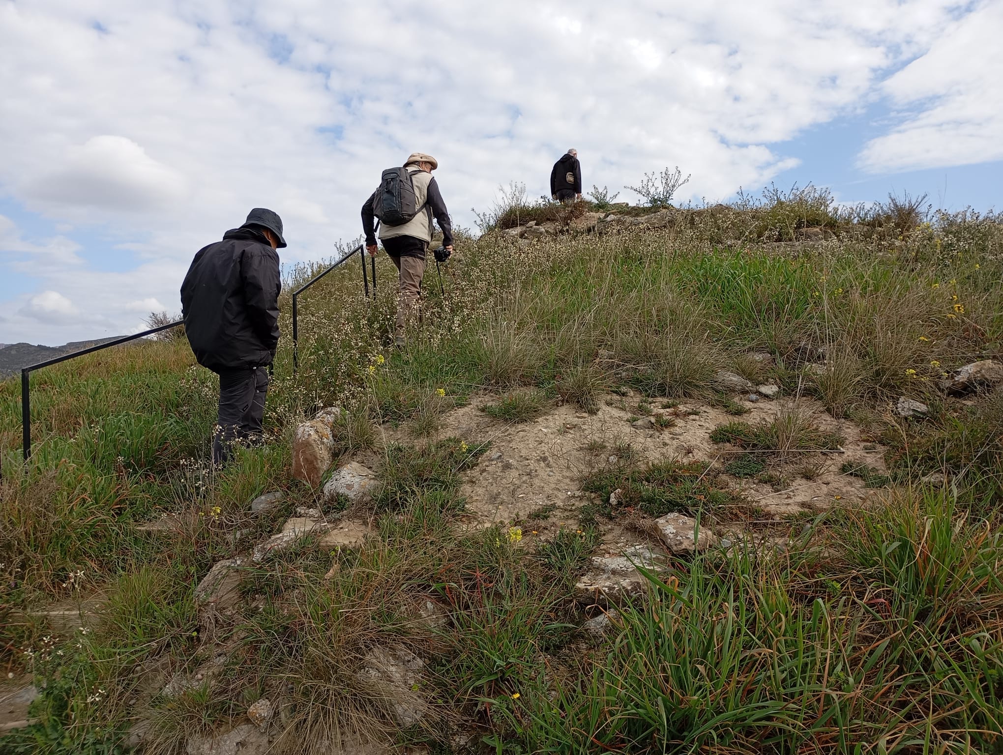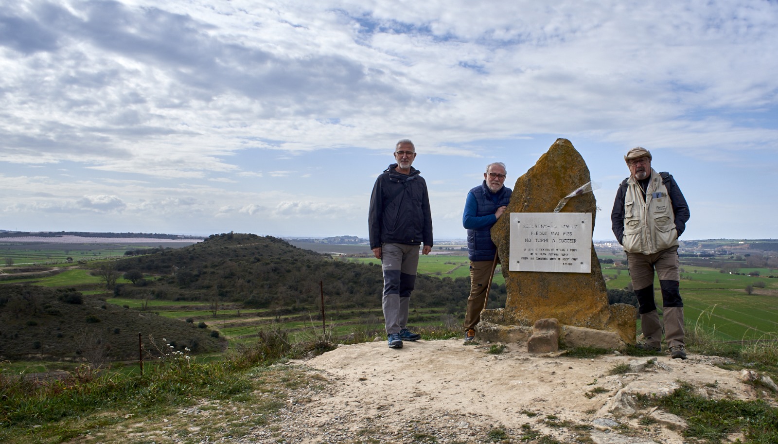 Després d’una aturada a la població de Sant Llorenç de Montgai, per saludar al pintor Lluc Blaya i al ceramista Jordi Rosell, Ramón Lladós i Josep Maria Font (fotografia), l’escultor Ramón Ruíz i Paco Castillo, van seguir camí fins el començament del camí de les trinxeres del turó que porta fins el cim (cota 305 del Tossal de Déu).