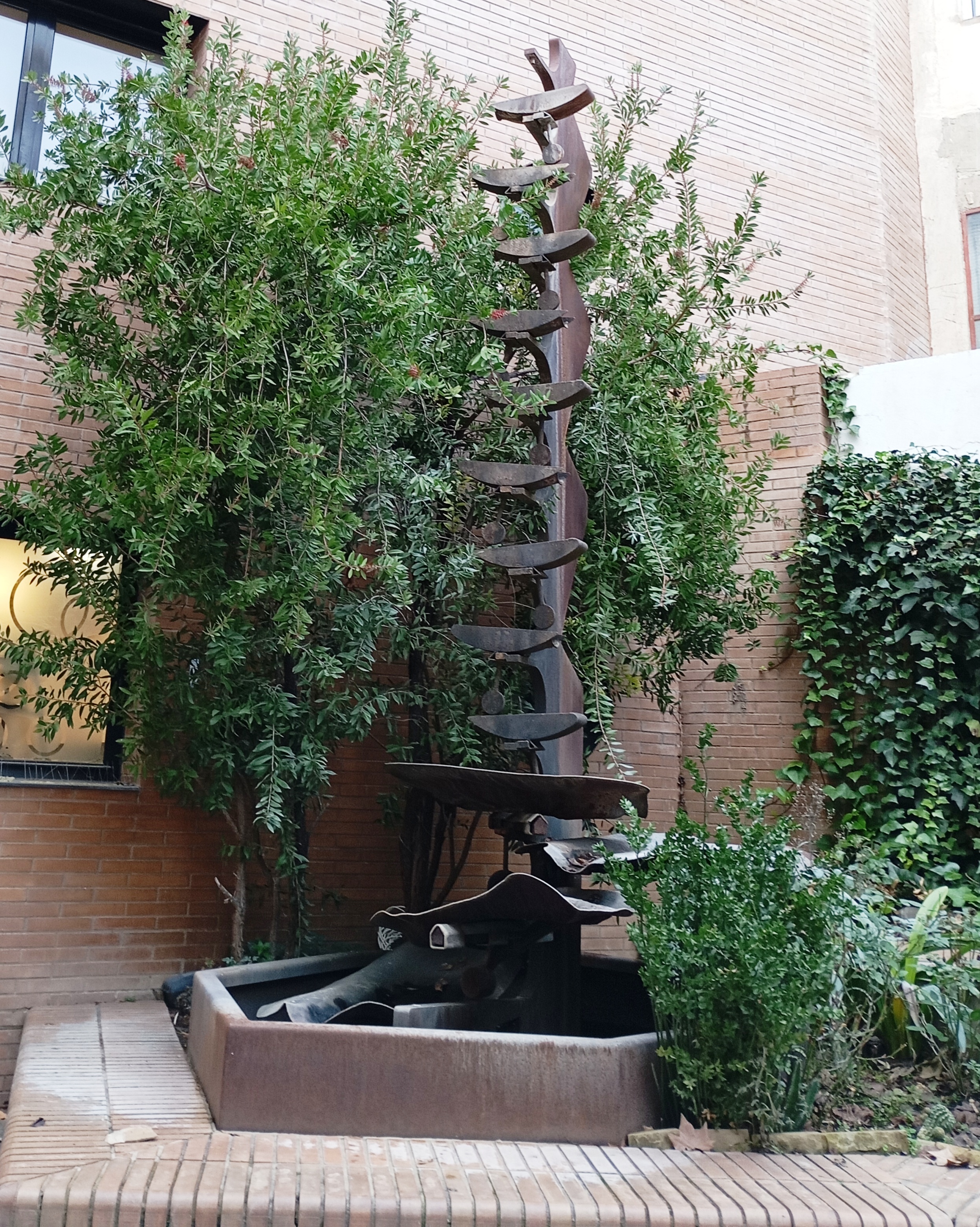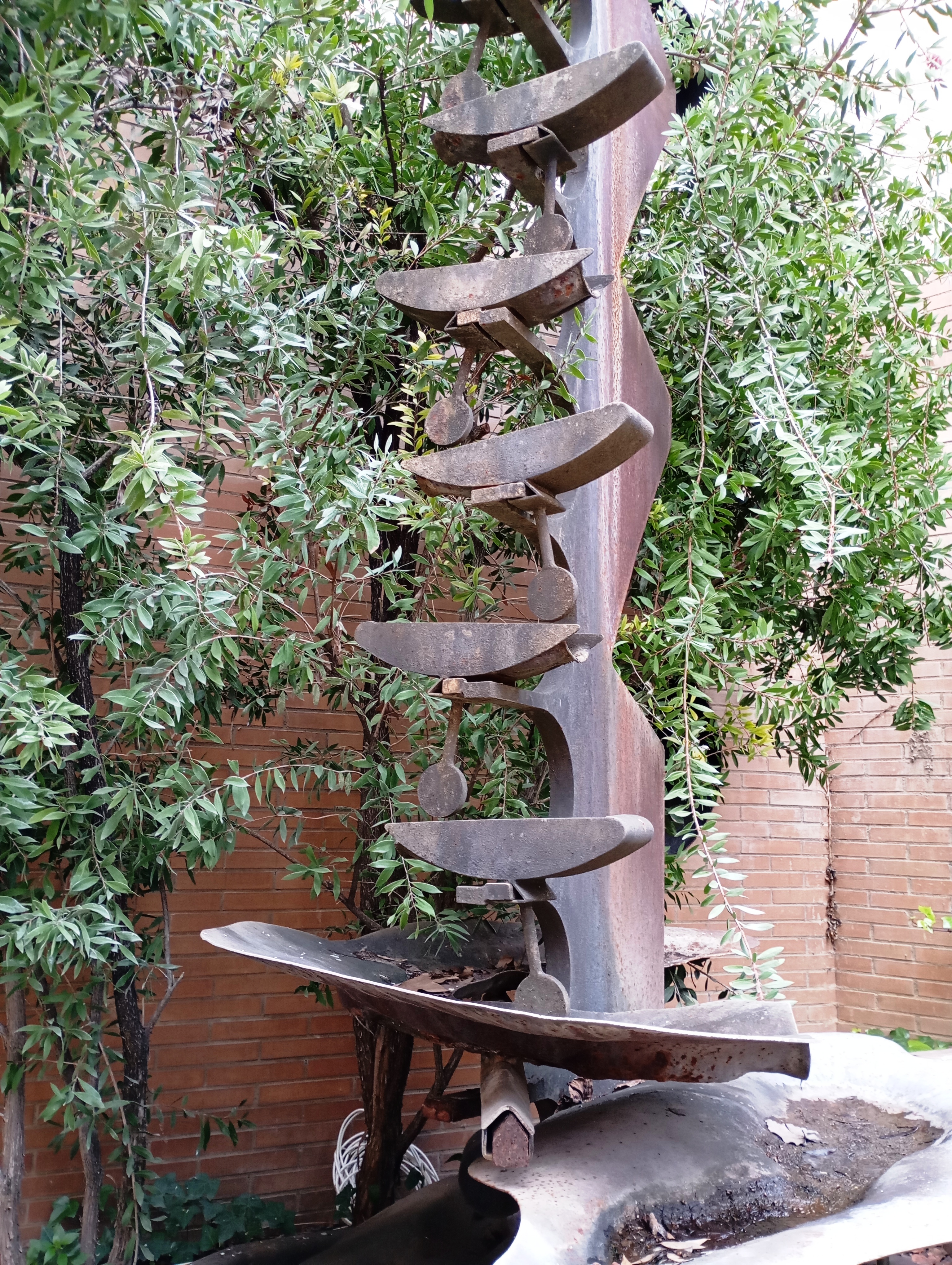 L’escultura del pati d’Orvepard representa una mena sínia vertical de ferro i acer corten que eleva aigua mitjançant un circuit tancat, a través de vasos basculants, des de l’embassament de la seva base fins al seu cim, deixant caure l’aigua dels vasos de nou a la bassa incrustada al sòl de l’obra.